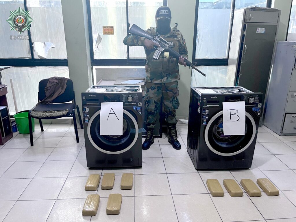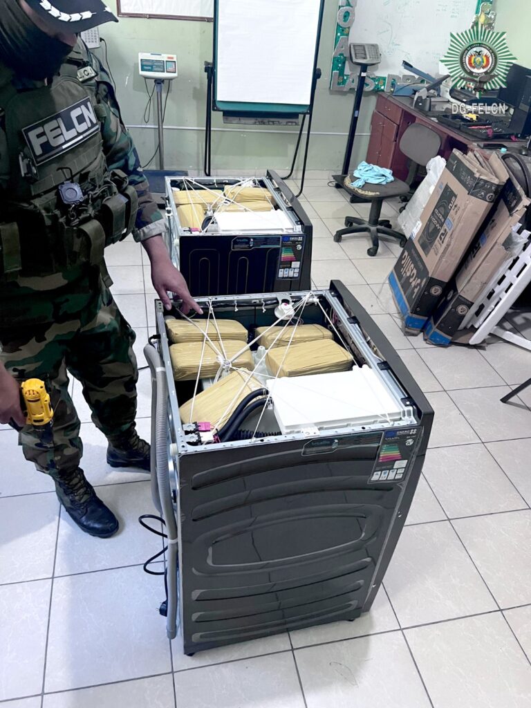 Tarija, 01 de abril de 2026.- En un operativo de control realizado en la terminal de buses de Tarija, efectivos de la Fuerza Especial de Lucha Contra el Narcotráfico (FELCN) incautaron dos lavadoras de ropa que contenían nueve paquetes con pasta base de cocaína ocultos en su interior, según informó la institución a través de sus canales oficiales. El cargamento provenía de Cochabamba y tenía como destino final las ciudades de Tarija y Bermejo.