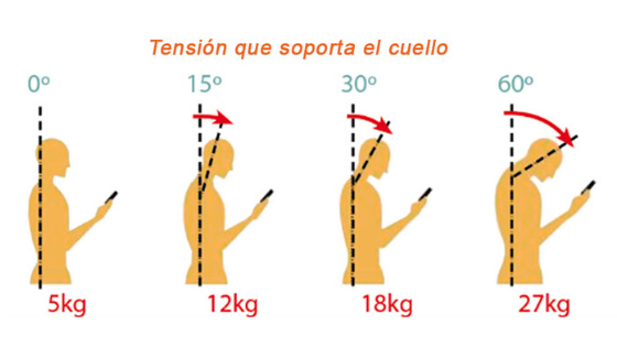 - A 15 grados: Tu cuello soporta el equivalente a 12 kg.