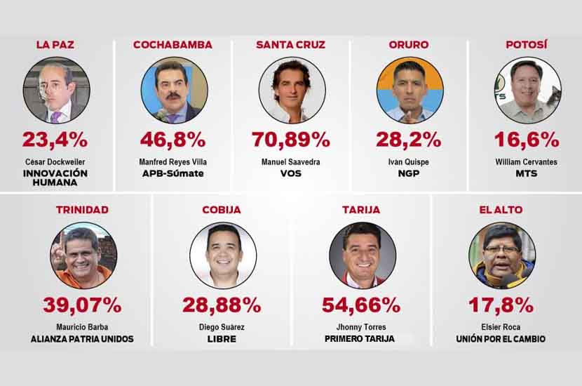 En la ciudad de La Paz, al 56,2% de las actas computadas, César Dockweiler, de la agrupación Innovación Humana, se impuso con el 23,25% de los votos. En Santa Cruz de la Sierra, al 71,28% del cómputo, el candidato Manuel Saavedra, de la alianza VOS, ganaba con el 71,38 % y se distanciaba de los restantes 13 postulantes con amplia mayoría, al punto de que el siguiente sumaba cerca del 7,5%.