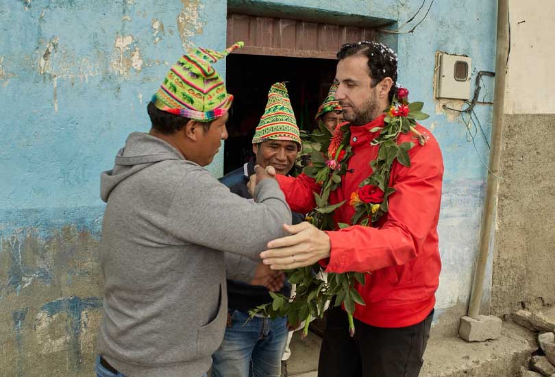 En las postales que compartió, se lo ve con mixtura blanca sobre la cabeza, una guirnalda de flores, regalos de los comunarios de la zona, que, además, una mesa con aguayos para que Velasco hable enfrente de la comunidad.