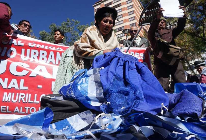 En las afueras del TSE, en la ciudad de La Paz, los militantes del evismo presentaron sus formularios de renuncia al MAS y tiraron banderas y otros distintivos azules, en señal de protesta contra los arcistas, a quienes acusan de haberles “robado” la sigla.