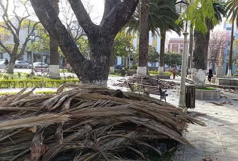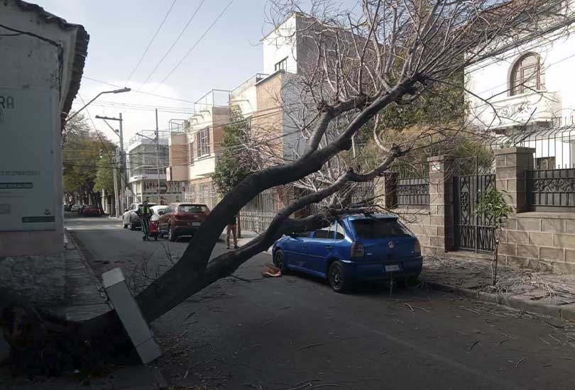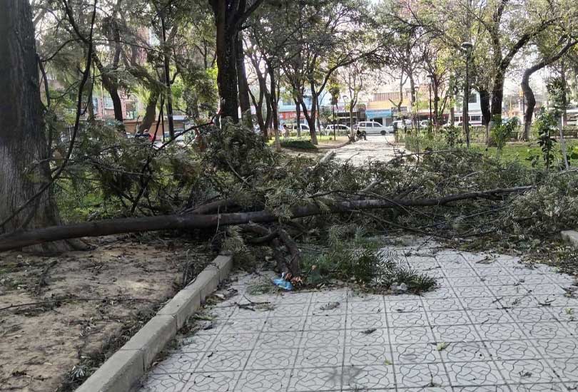 Además, se registraron otros incidentes en distintos puntos de la ciudad: la caída de árboles en la plaza El Molino, la caída de palmas de las palmeras en la plaza principal y un árbol que se desplomó sobre un vehículo en la calle Ingavi, en pleno centro.