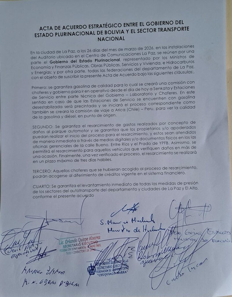 Este jueves, 26 de marzo, el Gobierno, representado por los ministros de Economía y Finanzas Públicas, Gabriel Espinoza; Obras Públicas Servicios y Vivienda, Mauricio Zamora; e Hidrocarburos y Energías, Mauricio Medinaceli, reunidos con todas los federaciones de transporte del departamento de La Paz lograron suscribir un acuerdo que da fin al paro indefinido decretado el miércoles por la noche por los choferes, en protesta por la mala calidad de la gasolina, que ha arruinado sus unidades de transporte, y a la vez, por el retraso, según ellos, en la compensación que el Estado empezó a entregar esta semana.