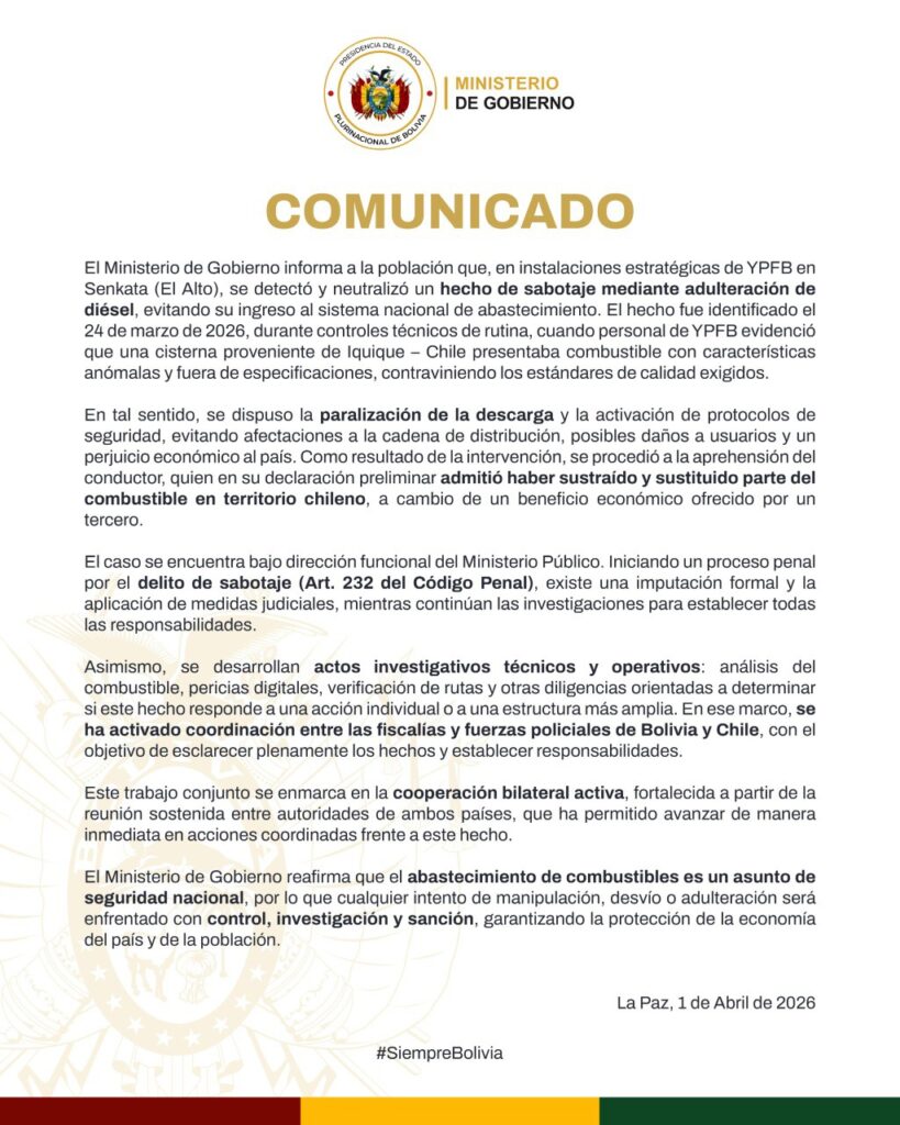 Mediante un comunicado, el Ministerio de Gobierno denunció que en instalaciones de Yacimientos Petrolíferos Fiscales (YPFB) de El Alto, se detectó un hecho de sabotaje mediante la adulteración de diésel y logró evitar que el combustible irregular ingrese al sistema de abastecimiento.