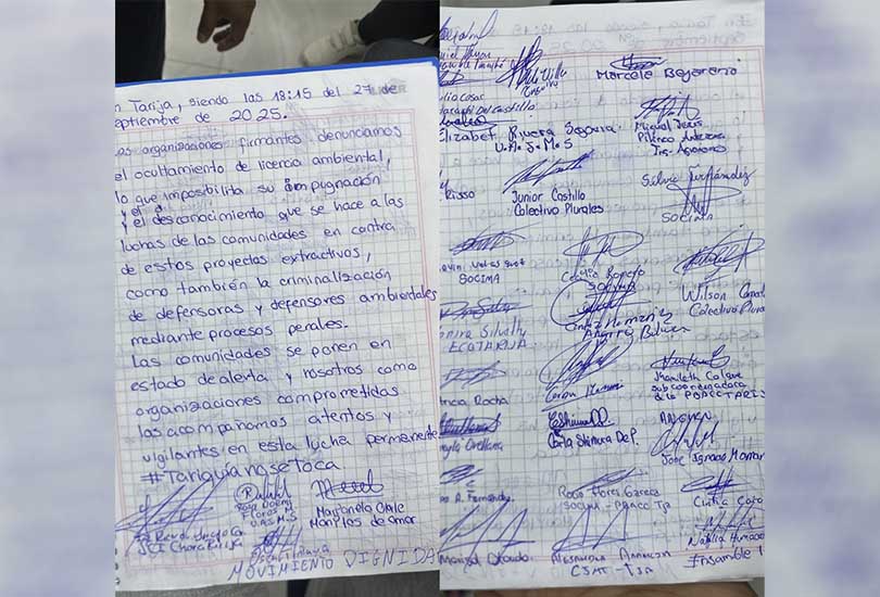 Estas organizaciones, junto a las demás plataformas firmantes, expresaron su rechazo al proceso de aprobación de la licencia ambiental, que calificaron como un acto que desconoce las voces y preocupaciones de los comunarios, además de impulsar la criminalización de los defensores ambientales mediante procesos judiciales.