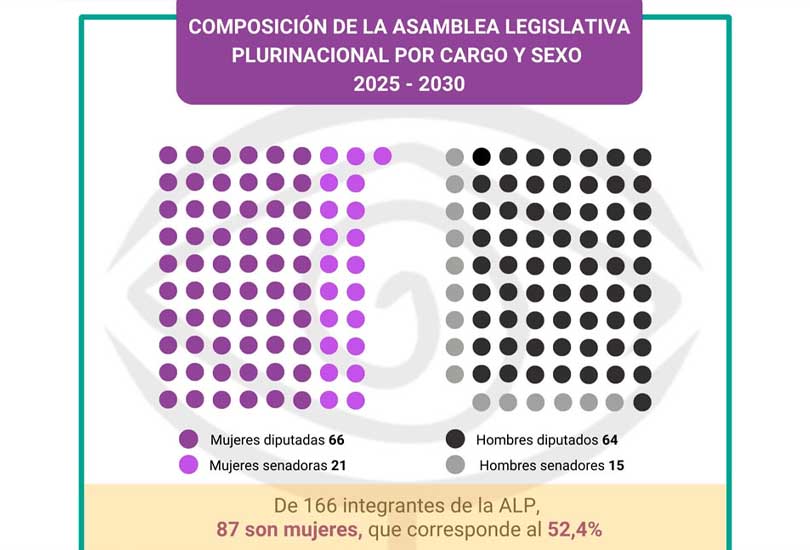 Tras los resultados oficiales de las Elecciones Generales 2025, la nueva configuración de la Asamblea Legislativa Plurinacional (ALP) marca un avance significativo en la participación política de las mujeres en Bolivia. En la Cámara de Senadores, 21 de los 36 escaños (58,3 %) serán ocupados por mujeres, mientras que en la Cámara de Diputados 66 de los 130 curules (50,7%) corresponderán a diputadas. En términos generales, las mujeres representarán el 52,4 % de los escaños legislativos, consolidando una mayoría inédita desde el retorno a la democracia.