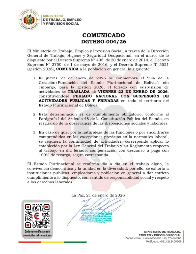 El mismo decreto crea dos feriados adicionales: “Adicional al feriado de Corpus Christi del jueves 4 de junio, se declara feriado nacional el viernes 5 de junio”, dice la norma y luego dispone otro feriado: “Adicional al feriado del Día de la Independencia de Bolivia del jueves 6 de agosto, se declara feriado nacional el día viernes 7 de agosto”.