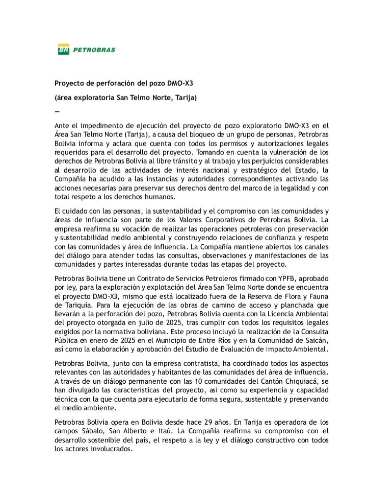 Por su parte, Petrobras emitió un comunicado oficial en el que aclara que cuenta con todos los permisos y autorizaciones legales necesarios para el desarrollo y ejecución del proyecto exploratorio DMO-X3. La empresa señaló además que mantiene abiertos los canales de diálogo y ratificó que el proyecto se encuentra fuera de los límites de la Reserva Nacional de Flora y Fauna Tariquía.
