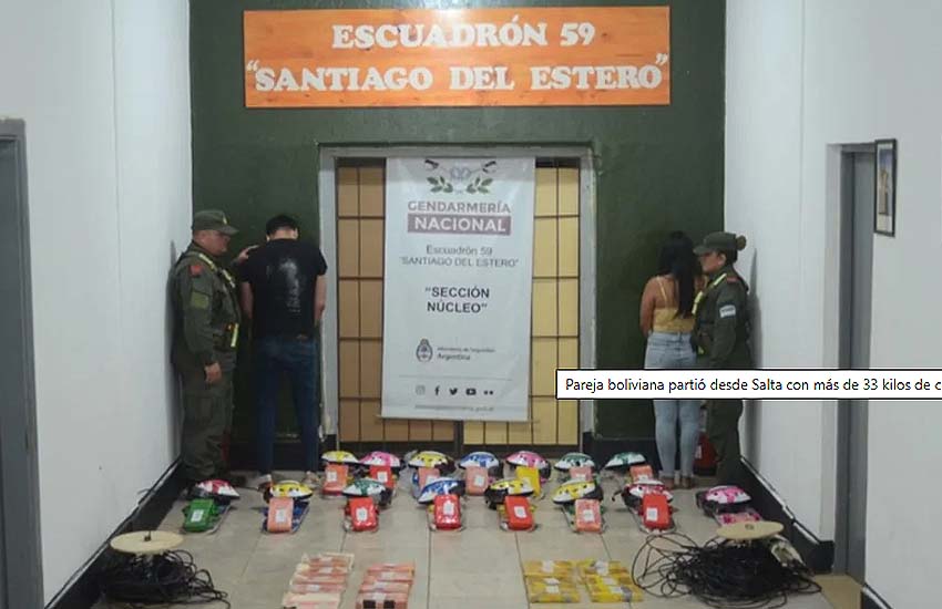Una pareja de nacionalidad boliviana fue detenida en Argentina al encontrarse en posesión de más de 33 kilos de cocaína. El hecho se produjo en Santiago del Estero, durante un control de Gendarmería Nacional sobre la Ruta Nacional N° 34, en el puesto Balanza la Tijera. El operativo estuvo a cargo del Escuadrón 59 de “Santiago del Estero” y permitió incautar 33 kilos y 669 gramos de la sustancia.