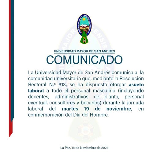 “La Universidad Mayor de San Andrés comunica a la comunidad universitaria que, mediante la Resolución Rectoral N.º 613, se ha dispuesto otorgar asueto laboral a todo el personal masculino”, señala el comunicado.