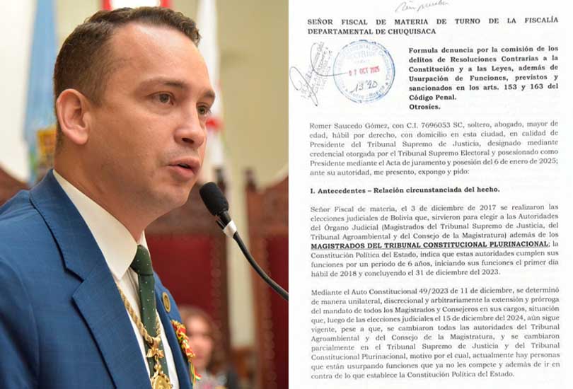 En la denuncia, presentada ante la Fiscalía de Chuquisaca, Saucedo señala que estos cinco “autoprorrogados” cometieron los delitos de usurpación de funciones y de resoluciones contrarias a la Constitución y las leyes.