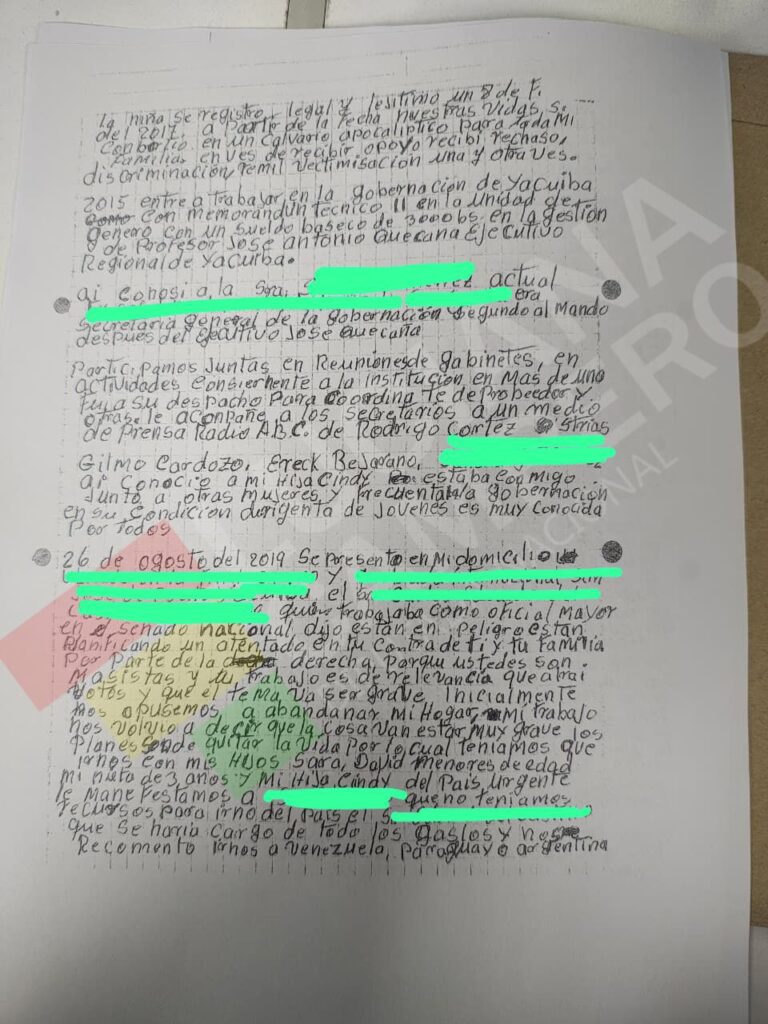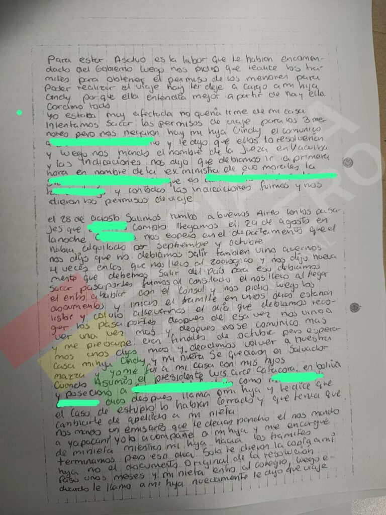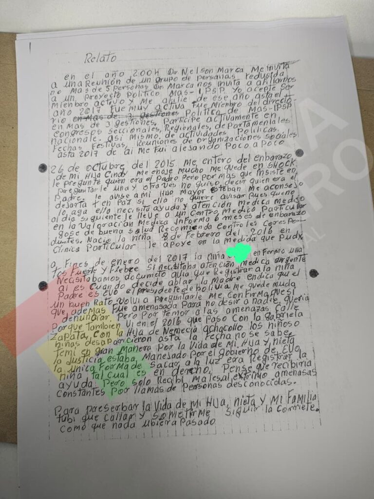 “Indica que el padre es Evo (Morales), el presidente de Bolivia, me quedé muda un buen rato, volvió a preguntarle y me confirma que sí. Además, fue amenazada para no decir a nadie”, se lee en la carta escrita a mano.