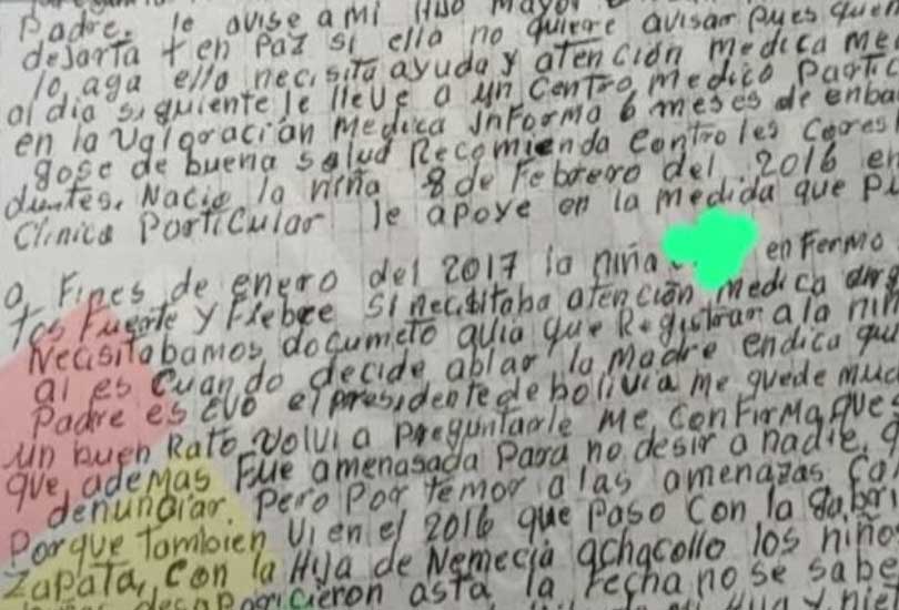“Indica que el padre es Evo (Morales), el presidente de Bolivia, me quedé muda un buen rato, volvió a preguntarle y me confirma que sí. Además, fue amenazada para no decir a nadie”, se lee en la carta escrita a mano.