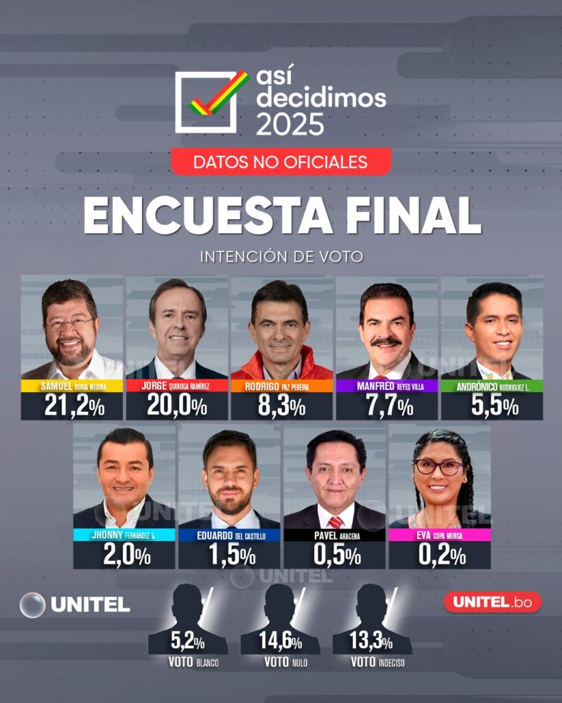 En paralelo, la encuesta nacional de IPSOS CiesMori para la red Unitel, realizada entre el 2 y el 6 de agosto, ubica nuevamente a Doria Medina en el primer lugar con un 21,2%, seguido de Quiroga con un 20%. En tercer lugar figura Rodrigo Paz, con un 8,3%. Un 33,1% de los encuestados se declaró indeciso o manifestó que votará en blanco o nulo.