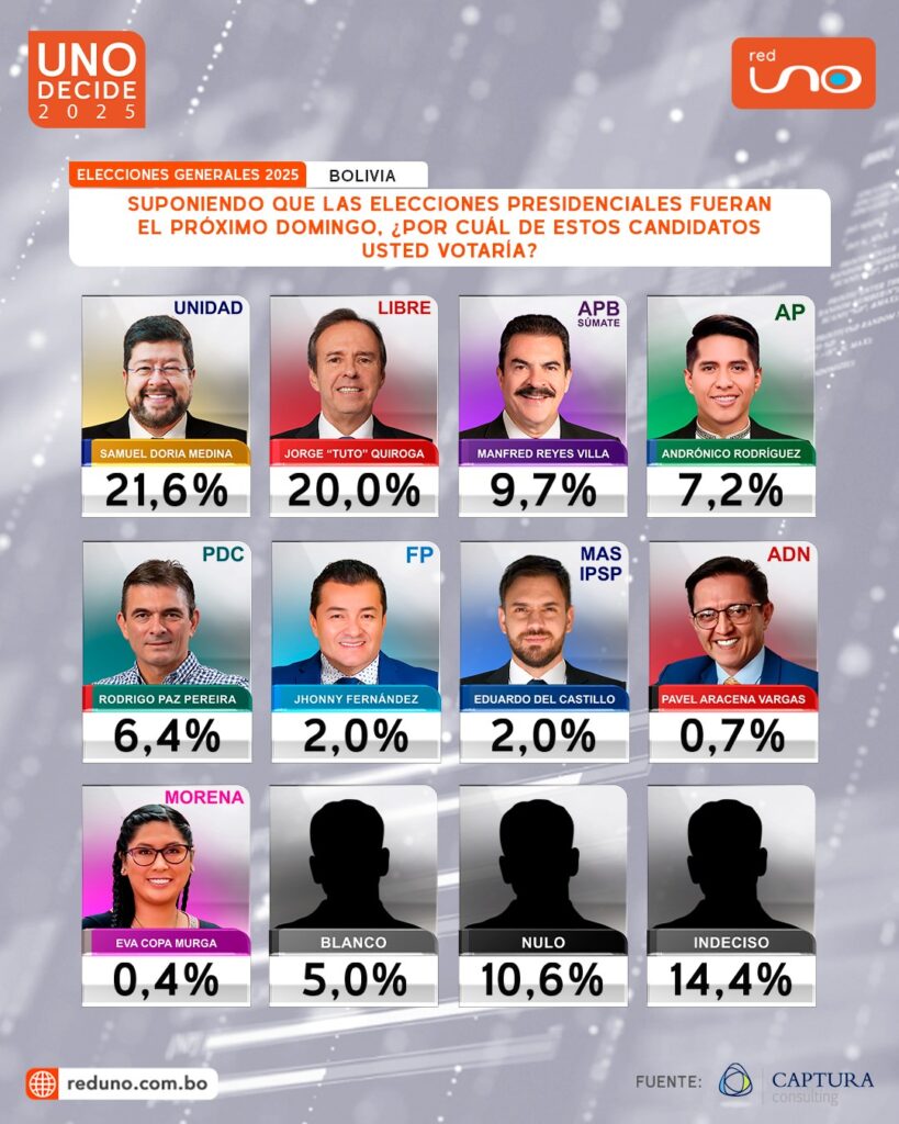 Según el estudio de Captura Consulting, realizado entre el 27 de julio y el 3 de agosto y presentado por Cadena A y Red Uno, Doria Medina encabeza con un 21,6% de respaldo. Le sigue Jorge “Tuto” Quiroga, de la Alianza Libre, con un 20,6%. Más de diez puntos por debajo aparece Manfred Reyes Villa, alcalde de Cochabamba, con un 9,7%, seguido del presidente del Senado, Andrónico Rodríguez (7,2%) y del senador Rodrigo Paz (6,4%).