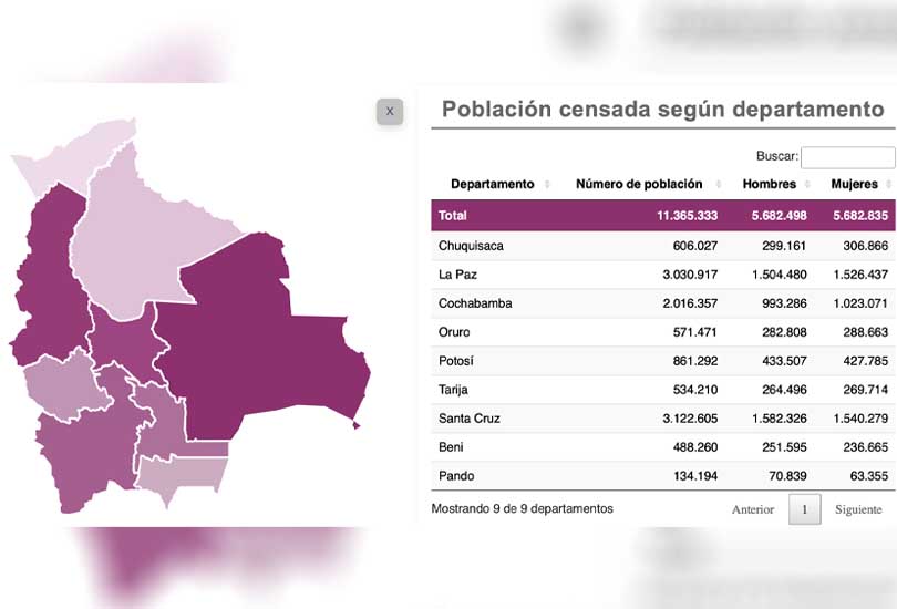 En Cochabamba, Chuquisaca Oruro, Tarija y La Paz predominan las mujeres y en Santa Cruz, Beni, Pando y Potosí, los hombres.