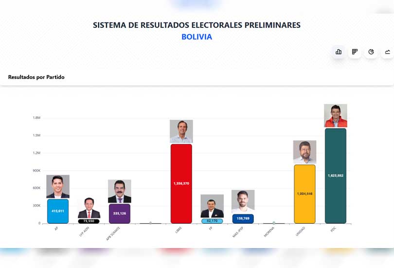 El Sistema de Resultados Electorales Preliminares, que mantiene desde ayer un avance del 95,41%, Paz se consolida en primer lugar con el 32,14% de los votos, seguido por Quiroga, con el 26,8%.